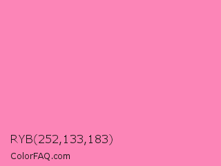RYB 252,133,183 Color is a light rose color and the nearest color is Persian Pink #f77fbe. Hex code #fc85b7 and RGB value is rgb(252,133,183). In RGB color space, this color is composed of 99% red, 52% green, 72% blue, In CMYK color space, this color is composed of 0% cyan, 47% magenta, 27% yellow , 1% black , In HSL color space, this color has a hue angle of 335° , 95% saturation and 75% lightness.