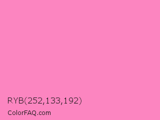 RYB 252,133,192 Color is a light rose color and the nearest color is Persian Pink #f77fbe. Hex code #fc85c0 and RGB value is rgb(252,133,192). In RGB color space, this color is composed of 99% red, 52% green, 75% blue, In CMYK color space, this color is composed of 0% cyan, 47% magenta, 24% yellow , 1% black , In HSL color space, this color has a hue angle of 330° , 95% saturation and 75% lightness.