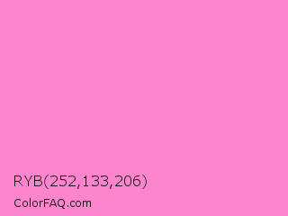 RYB 252,133,206 Color is a light magenta color and the nearest color is Princess Perfume #ff85cf. Hex code #fc85ce and RGB value is rgb(252,133,206). In RGB color space, this color is composed of 99% red, 52% green, 81% blue, In CMYK color space, this color is composed of 0% cyan, 47% magenta, 18% yellow , 1% black , In HSL color space, this color has a hue angle of 323° , 95% saturation and 75% lightness.