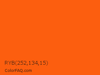 RYB 252,134,15 Color is a normal orange color and the nearest color is Giants Orange #fe5a1d. Hex code #fc5e0f and RGB value is rgb(252,94,15). In RGB color space, this color is composed of 99% red, 37% green, 6% blue, In CMYK color space, this color is composed of 0% cyan, 63% magenta, 94% yellow , 1% black , In HSL color space, this color has a hue angle of 20° , 98% saturation and 52% lightness.