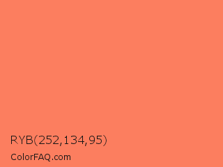 RYB 252,134,95 Color is a light red color and the nearest color is Coral Reef Hipster Salmon #fd7c6e. Hex code #fc7e5f and RGB value is rgb(252,126,95). In RGB color space, this color is composed of 99% red, 49% green, 37% blue, In CMYK color space, this color is composed of 0% cyan, 50% magenta, 62% yellow , 1% black , In HSL color space, this color has a hue angle of 12° , 96% saturation and 68% lightness.