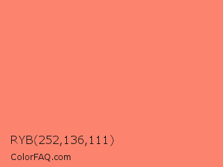 RYB 252,136,111 Color is a light red color and the nearest color is Salmon #fa8072. Hex code #fc846f and RGB value is rgb(252,132,111). In RGB color space, this color is composed of 99% red, 52% green, 44% blue, In CMYK color space, this color is composed of 0% cyan, 48% magenta, 56% yellow , 1% black , In HSL color space, this color has a hue angle of 9° , 96% saturation and 71% lightness.