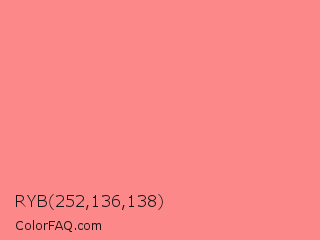 RYB 252,136,138 Color is a light red color and the nearest color is Geraldine #fb8989. Hex code #fc888a and RGB value is rgb(252,136,138). In RGB color space, this color is composed of 99% red, 53% green, 54% blue, In CMYK color space, this color is composed of 0% cyan, 46% magenta, 45% yellow , 1% black , In HSL color space, this color has a hue angle of 359° , 95% saturation and 76% lightness.