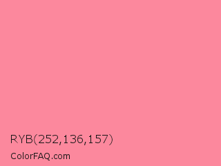 RYB 252,136,157 Color is a light red color and the nearest color is Tickle Me Pink Crayola #fc80a5. Hex code #fc889d and RGB value is rgb(252,136,157). In RGB color space, this color is composed of 99% red, 53% green, 62% blue, In CMYK color space, this color is composed of 0% cyan, 46% magenta, 38% yellow , 1% black , In HSL color space, this color has a hue angle of 349° , 95% saturation and 76% lightness.