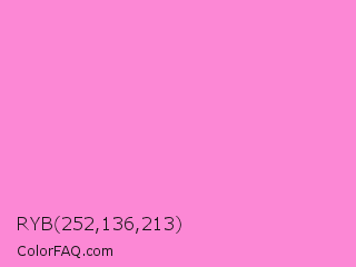 RYB 252,136,213 Color is a light magenta color and the nearest color is Princess Perfume #ff85cf. Hex code #fc88d5 and RGB value is rgb(252,136,213). In RGB color space, this color is composed of 99% red, 53% green, 84% blue, In CMYK color space, this color is composed of 0% cyan, 46% magenta, 15% yellow , 1% black , In HSL color space, this color has a hue angle of 320° , 95% saturation and 76% lightness.