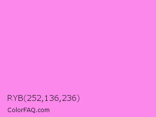 RYB 252,136,236 Color is a light magenta color and the nearest color is Light Fuchsia Pink #f984ef. Hex code #fc88ec and RGB value is rgb(252,136,236). In RGB color space, this color is composed of 99% red, 53% green, 93% blue, In CMYK color space, this color is composed of 0% cyan, 46% magenta, 6% yellow , 1% black , In HSL color space, this color has a hue angle of 308° , 95% saturation and 76% lightness.