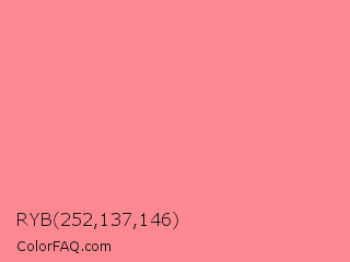 RYB 252,137,146 Color is a light red color and the nearest color is Tulip #ff878d. Hex code #fc8992 and RGB value is rgb(252,137,146). In RGB color space, this color is composed of 99% red, 54% green, 57% blue, In CMYK color space, this color is composed of 0% cyan, 46% magenta, 42% yellow , 1% black , In HSL color space, this color has a hue angle of 355° , 95% saturation and 76% lightness.