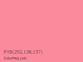 RYB 252,138,157 Color is a light red color and the nearest color is Pink Salmon #ff91a4. Hex code #fc8a9d and RGB value is rgb(252,138,157). In RGB color space, this color is composed of 99% red, 54% green, 62% blue, In CMYK color space, this color is composed of 0% cyan, 45% magenta, 38% yellow , 1% black , In HSL color space, this color has a hue angle of 350° , 95% saturation and 76% lightness.