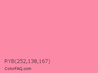 RYB 252,138,167 Color is a light red color and the nearest color is Tickle Me Pink #fc89ac. Hex code #fc8aa7 and RGB value is rgb(252,138,167). In RGB color space, this color is composed of 99% red, 54% green, 65% blue, In CMYK color space, this color is composed of 0% cyan, 45% magenta, 34% yellow , 1% black , In HSL color space, this color has a hue angle of 345° , 95% saturation and 76% lightness.