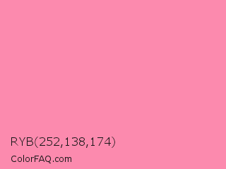 RYB 252,138,174 Color is a light rose color and the nearest color is Tickle Me Pink #fc89ac. Hex code #fc8aae and RGB value is rgb(252,138,174). In RGB color space, this color is composed of 99% red, 54% green, 68% blue, In CMYK color space, this color is composed of 0% cyan, 45% magenta, 31% yellow , 1% black , In HSL color space, this color has a hue angle of 341° , 95% saturation and 76% lightness.