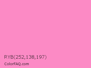RYB 252,138,197 Color is a light rose color and the nearest color is Princess Perfume #ff85cf. Hex code #fc8ac5 and RGB value is rgb(252,138,197). In RGB color space, this color is composed of 99% red, 54% green, 77% blue, In CMYK color space, this color is composed of 0% cyan, 45% magenta, 22% yellow , 1% black , In HSL color space, this color has a hue angle of 329° , 95% saturation and 76% lightness.