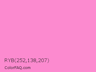 RYB 252,138,207 Color is a light magenta color and the nearest color is Princess Perfume #ff85cf. Hex code #fc8acf and RGB value is rgb(252,138,207). In RGB color space, this color is composed of 99% red, 54% green, 81% blue, In CMYK color space, this color is composed of 0% cyan, 45% magenta, 18% yellow , 1% black , In HSL color space, this color has a hue angle of 324° , 95% saturation and 76% lightness.