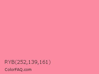 RYB 252,139,161 Color is a light red color and the nearest color is Pink Salmon #ff91a4. Hex code #fc8ba1 and RGB value is rgb(252,139,161). In RGB color space, this color is composed of 99% red, 55% green, 63% blue, In CMYK color space, this color is composed of 0% cyan, 45% magenta, 36% yellow , 1% black , In HSL color space, this color has a hue angle of 348° , 95% saturation and 77% lightness.