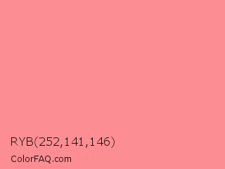 RYB 252,141,146 Color is a light red color and the nearest color is Tulip #ff878d. Hex code #fc8d92 and RGB value is rgb(252,141,146). In RGB color space, this color is composed of 99% red, 55% green, 57% blue, In CMYK color space, this color is composed of 0% cyan, 44% magenta, 42% yellow , 1% black , In HSL color space, this color has a hue angle of 357° , 95% saturation and 77% lightness.