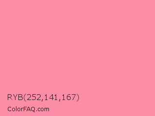 RYB 252,141,167 Color is a light red color and the nearest color is Flamingo Pink #fc8eac. Hex code #fc8da7 and RGB value is rgb(252,141,167). In RGB color space, this color is composed of 99% red, 55% green, 65% blue, In CMYK color space, this color is composed of 0% cyan, 44% magenta, 34% yellow , 1% black , In HSL color space, this color has a hue angle of 346° , 95% saturation and 77% lightness.