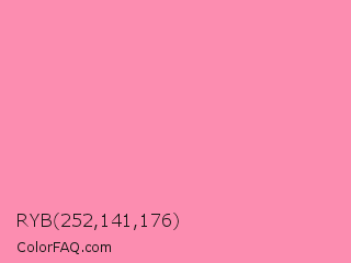 RYB 252,141,176 Color is a light rose color and the nearest color is Flamingo Pink #fc8eac. Hex code #fc8db0 and RGB value is rgb(252,141,176). In RGB color space, this color is composed of 99% red, 55% green, 69% blue, In CMYK color space, this color is composed of 0% cyan, 44% magenta, 30% yellow , 1% black , In HSL color space, this color has a hue angle of 341° , 95% saturation and 77% lightness.