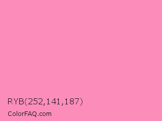 RYB 252,141,187 Color is a light rose color and the nearest color is Schauss Pink #ff91af. Hex code #fc8dbb and RGB value is rgb(252,141,187). In RGB color space, this color is composed of 99% red, 55% green, 73% blue, In CMYK color space, this color is composed of 0% cyan, 44% magenta, 26% yellow , 1% black , In HSL color space, this color has a hue angle of 335° , 95% saturation and 77% lightness.