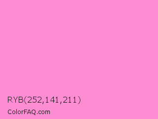 RYB 252,141,211 Color is a light magenta color and the nearest color is Princess Perfume #ff85cf. Hex code #fc8dd3 and RGB value is rgb(252,141,211). In RGB color space, this color is composed of 99% red, 55% green, 83% blue, In CMYK color space, this color is composed of 0% cyan, 44% magenta, 16% yellow , 1% black , In HSL color space, this color has a hue angle of 322° , 95% saturation and 77% lightness.