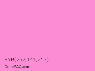 RYB 252,141,213 Color is a light magenta color and the nearest color is Princess Perfume #ff85cf. Hex code #fc8dd5 and RGB value is rgb(252,141,213). In RGB color space, this color is composed of 99% red, 55% green, 84% blue, In CMYK color space, this color is composed of 0% cyan, 44% magenta, 15% yellow , 1% black , In HSL color space, this color has a hue angle of 321° , 95% saturation and 77% lightness.