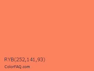 RYB 252,141,93 Color is a light red color and the nearest color is Coral #ff7f50. Hex code #fc825d and RGB value is rgb(252,130,93). In RGB color space, this color is composed of 99% red, 51% green, 36% blue, In CMYK color space, this color is composed of 0% cyan, 48% magenta, 63% yellow , 1% black , In HSL color space, this color has a hue angle of 14° , 96% saturation and 68% lightness.