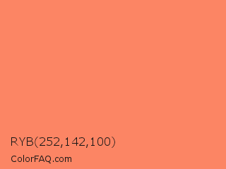 RYB 252,142,100 Color is a light red color and the nearest color is Salmon #ff8c69. Hex code #fc8564 and RGB value is rgb(252,133,100). In RGB color space, this color is composed of 99% red, 52% green, 39% blue, In CMYK color space, this color is composed of 0% cyan, 47% magenta, 60% yellow , 1% black , In HSL color space, this color has a hue angle of 13° , 96% saturation and 69% lightness.