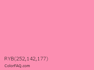 RYB 252,142,177 Color is a light rose color and the nearest color is Schauss Pink #ff91af. Hex code #fc8eb1 and RGB value is rgb(252,142,177). In RGB color space, this color is composed of 99% red, 56% green, 69% blue, In CMYK color space, this color is composed of 0% cyan, 44% magenta, 30% yellow , 1% black , In HSL color space, this color has a hue angle of 341° , 95% saturation and 77% lightness.