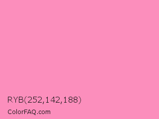 RYB 252,142,188 Color is a light rose color and the nearest color is Schauss Pink #ff91af. Hex code #fc8ebc and RGB value is rgb(252,142,188). In RGB color space, this color is composed of 99% red, 56% green, 74% blue, In CMYK color space, this color is composed of 0% cyan, 44% magenta, 25% yellow , 1% black , In HSL color space, this color has a hue angle of 335° , 95% saturation and 77% lightness.