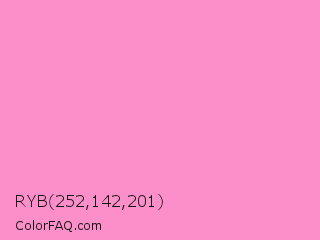 RYB 252,142,201 Color is a light rose color and the nearest color is Princess Perfume #ff85cf. Hex code #fc8ec9 and RGB value is rgb(252,142,201). In RGB color space, this color is composed of 99% red, 56% green, 79% blue, In CMYK color space, this color is composed of 0% cyan, 44% magenta, 20% yellow , 1% black , In HSL color space, this color has a hue angle of 328° , 95% saturation and 77% lightness.