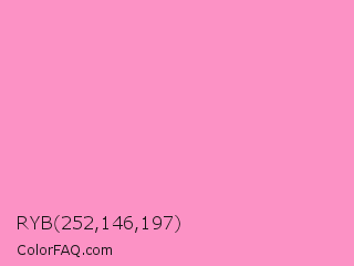 RYB 252,146,197 Color is a light rose color and the nearest color is Pale Magenta Pink #ff99cc. Hex code #fc92c5 and RGB value is rgb(252,146,197). In RGB color space, this color is composed of 99% red, 57% green, 77% blue, In CMYK color space, this color is composed of 0% cyan, 42% magenta, 22% yellow , 1% black , In HSL color space, this color has a hue angle of 331° , 95% saturation and 78% lightness.