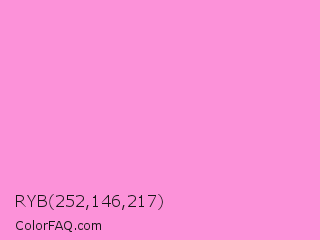 RYB 252,146,217 Color is a light magenta color and the nearest color is Pale Magenta Pink #ff99cc. Hex code #fc92d9 and RGB value is rgb(252,146,217). In RGB color space, this color is composed of 99% red, 57% green, 85% blue, In CMYK color space, this color is composed of 0% cyan, 42% magenta, 14% yellow , 1% black , In HSL color space, this color has a hue angle of 320° , 95% saturation and 78% lightness.