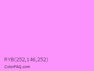 RYB 252,146,252 Color is a light magenta color and the nearest color is Light Fuchsia Pink #f984ef. Hex code #fc92fc and RGB value is rgb(252,146,252). In RGB color space, this color is composed of 99% red, 57% green, 99% blue, In CMYK color space, this color is composed of 0% cyan, 42% magenta, 0% yellow , 1% black , In HSL color space, this color has a hue angle of 300° , 95% saturation and 78% lightness.
