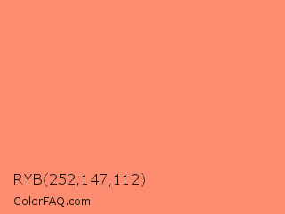 RYB 252,147,112 Color is a light red color and the nearest color is Salmon #ff8c69. Hex code #fc8c70 and RGB value is rgb(252,140,112). In RGB color space, this color is composed of 99% red, 55% green, 44% blue, In CMYK color space, this color is composed of 0% cyan, 44% magenta, 56% yellow , 1% black , In HSL color space, this color has a hue angle of 12° , 96% saturation and 71% lightness.