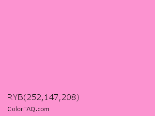 RYB 252,147,208 Color is a light magenta color and the nearest color is Pale Magenta Pink #ff99cc. Hex code #fc93d0 and RGB value is rgb(252,147,208). In RGB color space, this color is composed of 99% red, 58% green, 82% blue, In CMYK color space, this color is composed of 0% cyan, 42% magenta, 17% yellow , 1% black , In HSL color space, this color has a hue angle of 325° , 95% saturation and 78% lightness.