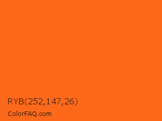 RYB 252,147,26 Color is a normal orange color and the nearest color is Orange #ff681f. Hex code #fc691a and RGB value is rgb(252,105,26). In RGB color space, this color is composed of 99% red, 41% green, 10% blue, In CMYK color space, this color is composed of 0% cyan, 58% magenta, 90% yellow , 1% black , In HSL color space, this color has a hue angle of 21° , 97% saturation and 55% lightness.