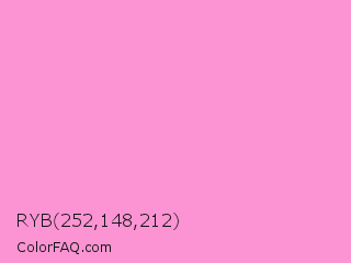 RYB 252,148,212 Color is a light magenta color and the nearest color is Pale Magenta Pink #ff99cc. Hex code #fc94d4 and RGB value is rgb(252,148,212). In RGB color space, this color is composed of 99% red, 58% green, 83% blue, In CMYK color space, this color is composed of 0% cyan, 41% magenta, 16% yellow , 1% black , In HSL color space, this color has a hue angle of 323° , 95% saturation and 78% lightness.