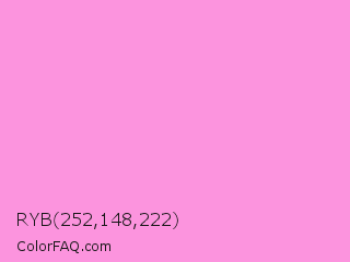 RYB 252,148,222 Color is a light magenta color and the nearest color is Lavender Rose #fba0e3. Hex code #fc94de and RGB value is rgb(252,148,222). In RGB color space, this color is composed of 99% red, 58% green, 87% blue, In CMYK color space, this color is composed of 0% cyan, 41% magenta, 12% yellow , 1% black , In HSL color space, this color has a hue angle of 317° , 95% saturation and 78% lightness.
