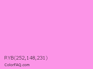 RYB 252,148,231 Color is a light magenta color and the nearest color is Lavender Rose #fba0e3. Hex code #fc94e7 and RGB value is rgb(252,148,231). In RGB color space, this color is composed of 99% red, 58% green, 91% blue, In CMYK color space, this color is composed of 0% cyan, 41% magenta, 8% yellow , 1% black , In HSL color space, this color has a hue angle of 312° , 95% saturation and 78% lightness.