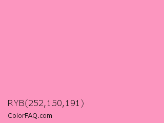 RYB 252,150,191 Color is a light rose color and the nearest color is Pastel Magenta #f49ac2. Hex code #fc96bf and RGB value is rgb(252,150,191). In RGB color space, this color is composed of 99% red, 59% green, 75% blue, In CMYK color space, this color is composed of 0% cyan, 40% magenta, 24% yellow , 1% black , In HSL color space, this color has a hue angle of 336° , 94% saturation and 79% lightness.