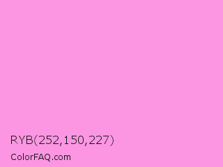 RYB 252,150,227 Color is a light magenta color and the nearest color is Lavender Rose #fba0e3. Hex code #fc96e3 and RGB value is rgb(252,150,227). In RGB color space, this color is composed of 99% red, 59% green, 89% blue, In CMYK color space, this color is composed of 0% cyan, 40% magenta, 10% yellow , 1% black , In HSL color space, this color has a hue angle of 315° , 94% saturation and 79% lightness.