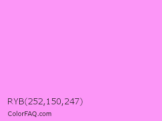 RYB 252,150,247 Color is a light magenta color and the nearest color is Light Fuchsia Pink #f984ef. Hex code #fc96f7 and RGB value is rgb(252,150,247). In RGB color space, this color is composed of 99% red, 59% green, 97% blue, In CMYK color space, this color is composed of 0% cyan, 40% magenta, 2% yellow , 1% black , In HSL color space, this color has a hue angle of 303° , 94% saturation and 79% lightness.