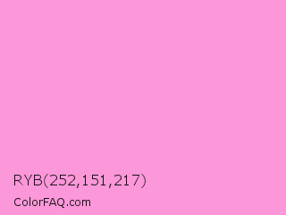 RYB 252,151,217 Color is a light magenta color and the nearest color is Lavender Rose #fba0e3. Hex code #fc97d9 and RGB value is rgb(252,151,217). In RGB color space, this color is composed of 99% red, 59% green, 85% blue, In CMYK color space, this color is composed of 0% cyan, 40% magenta, 14% yellow , 1% black , In HSL color space, this color has a hue angle of 321° , 94% saturation and 79% lightness.