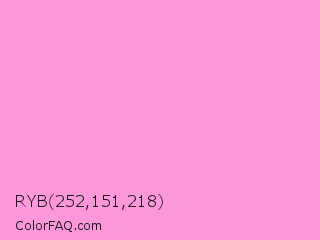 RYB 252,151,218 Color is a light magenta color and the nearest color is Lavender Rose #fba0e3. Hex code #fc97da and RGB value is rgb(252,151,218). In RGB color space, this color is composed of 99% red, 59% green, 85% blue, In CMYK color space, this color is composed of 0% cyan, 40% magenta, 13% yellow , 1% black , In HSL color space, this color has a hue angle of 320° , 94% saturation and 79% lightness.