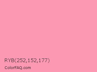 RYB 252,152,177 Color is a light red color and the nearest color is Schauss Pink #ff91af. Hex code #fc98b1 and RGB value is rgb(252,152,177). In RGB color space, this color is composed of 99% red, 60% green, 69% blue, In CMYK color space, this color is composed of 0% cyan, 40% magenta, 30% yellow , 1% black , In HSL color space, this color has a hue angle of 345° , 94% saturation and 79% lightness.