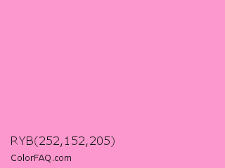 RYB 252,152,205 Color is a light rose color and the nearest color is Pale Magenta Pink #ff99cc. Hex code #fc98cd and RGB value is rgb(252,152,205). In RGB color space, this color is composed of 99% red, 60% green, 80% blue, In CMYK color space, this color is composed of 0% cyan, 40% magenta, 19% yellow , 1% black , In HSL color space, this color has a hue angle of 328° , 94% saturation and 79% lightness.