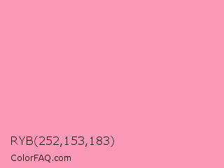 RYB 252,153,183 Color is a light rose color and the nearest color is Schauss Pink #ff91af. Hex code #fc99b7 and RGB value is rgb(252,153,183). In RGB color space, this color is composed of 99% red, 60% green, 72% blue, In CMYK color space, this color is composed of 0% cyan, 39% magenta, 27% yellow , 1% black , In HSL color space, this color has a hue angle of 342° , 94% saturation and 79% lightness.