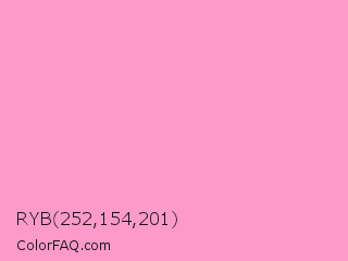 RYB 252,154,201 Color is a light rose color and the nearest color is Pale Magenta Pink #ff99cc. Hex code #fc9ac9 and RGB value is rgb(252,154,201). In RGB color space, this color is composed of 99% red, 60% green, 79% blue, In CMYK color space, this color is composed of 0% cyan, 39% magenta, 20% yellow , 1% black , In HSL color space, this color has a hue angle of 331° , 94% saturation and 80% lightness.