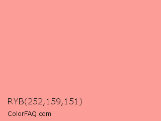 RYB 252,159,151 Color is a light red color and the nearest color is Mona Lisa #ffa194. Hex code #fc9e97 and RGB value is rgb(252,158,151). In RGB color space, this color is composed of 99% red, 62% green, 59% blue, In CMYK color space, this color is composed of 0% cyan, 37% magenta, 40% yellow , 1% black , In HSL color space, this color has a hue angle of 4° , 94% saturation and 79% lightness.