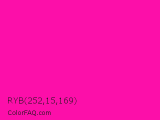 RYB 252,15,169 Color is a normal magenta color and the nearest color is Hollywood Cerise #f400a1. Hex code #fc0fa9 and RGB value is rgb(252,15,169). In RGB color space, this color is composed of 99% red, 6% green, 66% blue, In CMYK color space, this color is composed of 0% cyan, 94% magenta, 33% yellow , 1% black , In HSL color space, this color has a hue angle of 321° , 98% saturation and 52% lightness.