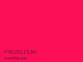 RYB 252,15,86 Color is a normal rose color and the nearest color is Folly #ff004f. Hex code #fc0f56 and RGB value is rgb(252,15,86). In RGB color space, this color is composed of 99% red, 6% green, 34% blue, In CMYK color space, this color is composed of 0% cyan, 94% magenta, 66% yellow , 1% black , In HSL color space, this color has a hue angle of 342° , 98% saturation and 52% lightness.