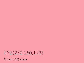 RYB 252,160,173 Color is a very light red color and the nearest color is Sweet Pink #fd9fa2. Hex code #fca0ad and RGB value is rgb(252,160,173). In RGB color space, this color is composed of 99% red, 63% green, 68% blue, In CMYK color space, this color is composed of 0% cyan, 37% magenta, 31% yellow , 1% black , In HSL color space, this color has a hue angle of 352° , 94% saturation and 81% lightness.